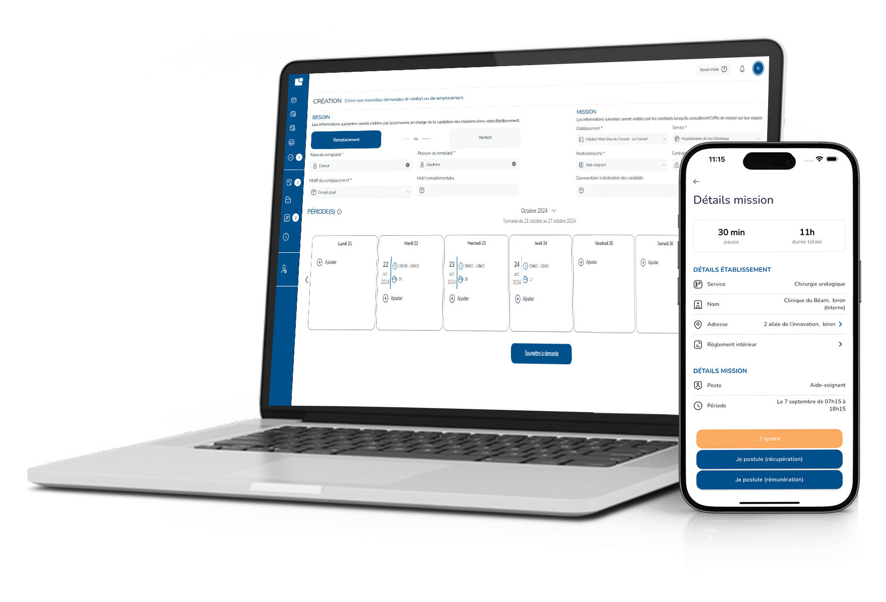 Saisissez une demande de remplacement ou de renfort en définissant le service, la fonction et la période concernée par la mission